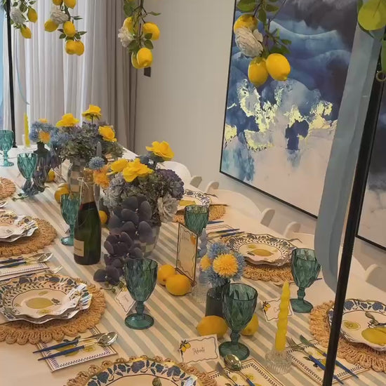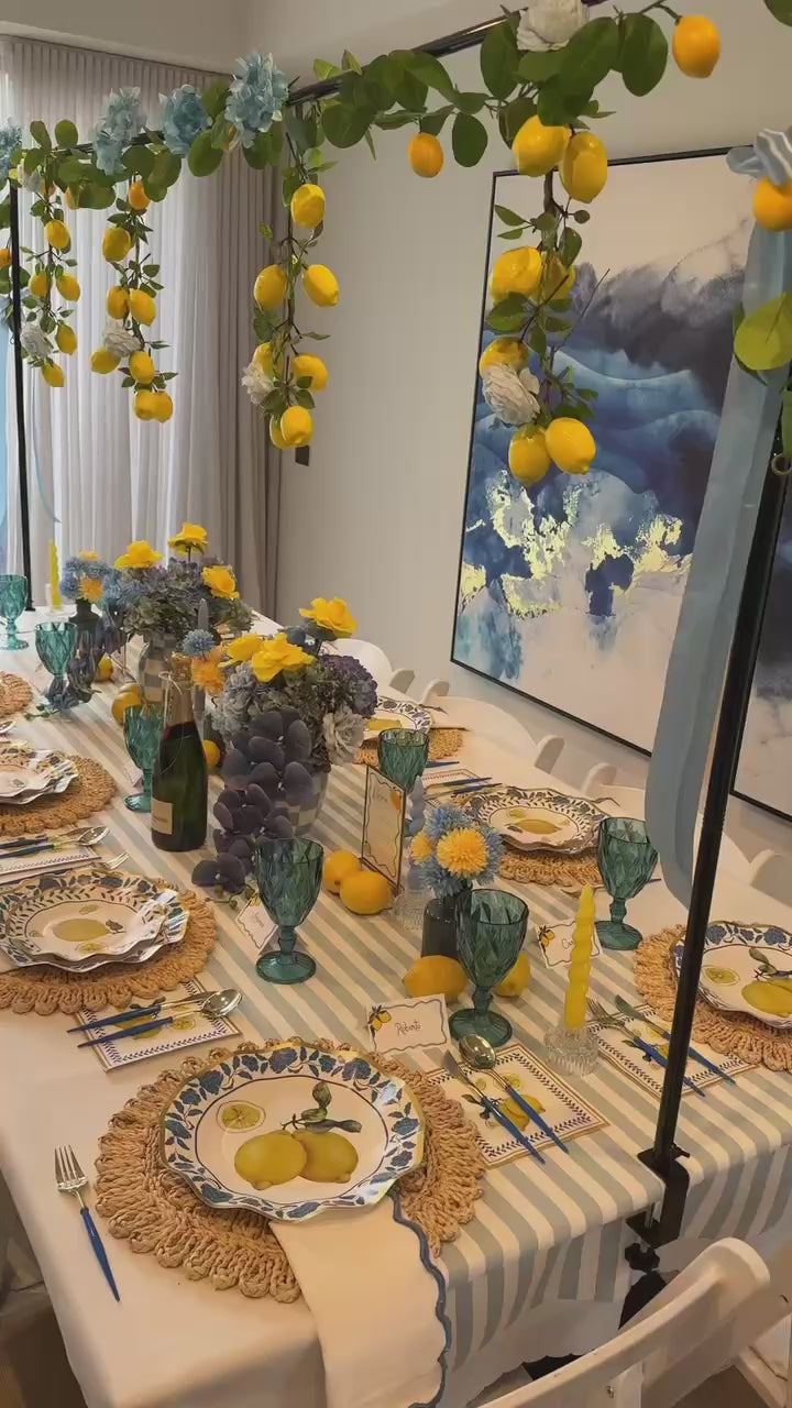 Transform your table into a Mediterranean paradise with our Cala-Breezy set! Featuring vibrant lemons and blue patterns, inspired by coastal charm, this collection is perfect for summer celebrations, bridal showers, al fresco dining, or adding a burst of sunshine to any event. Its intricate details and bold colors make every meal feel like a getaway.
