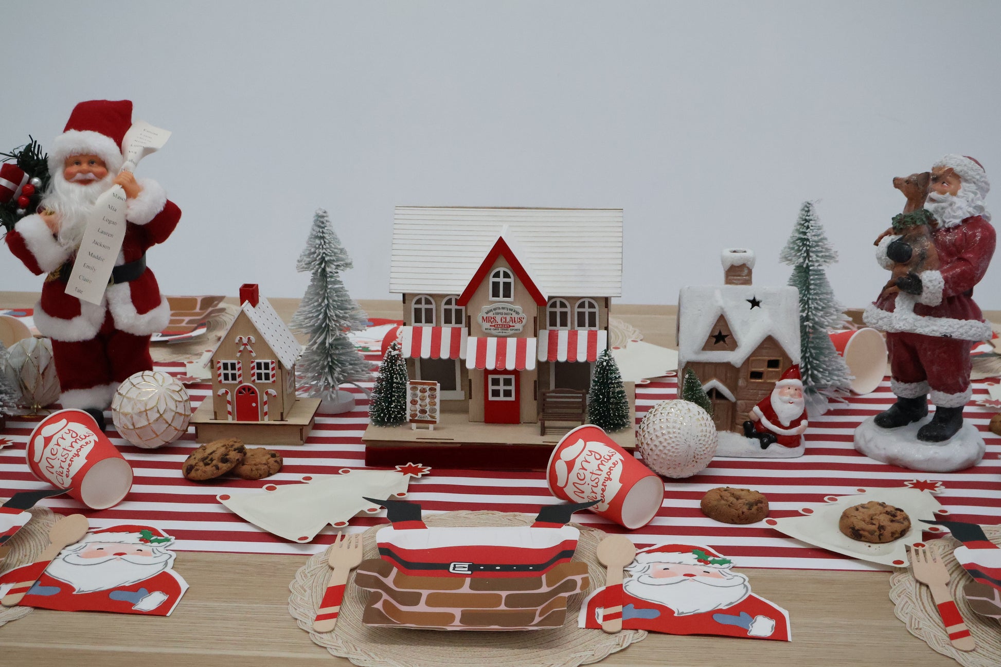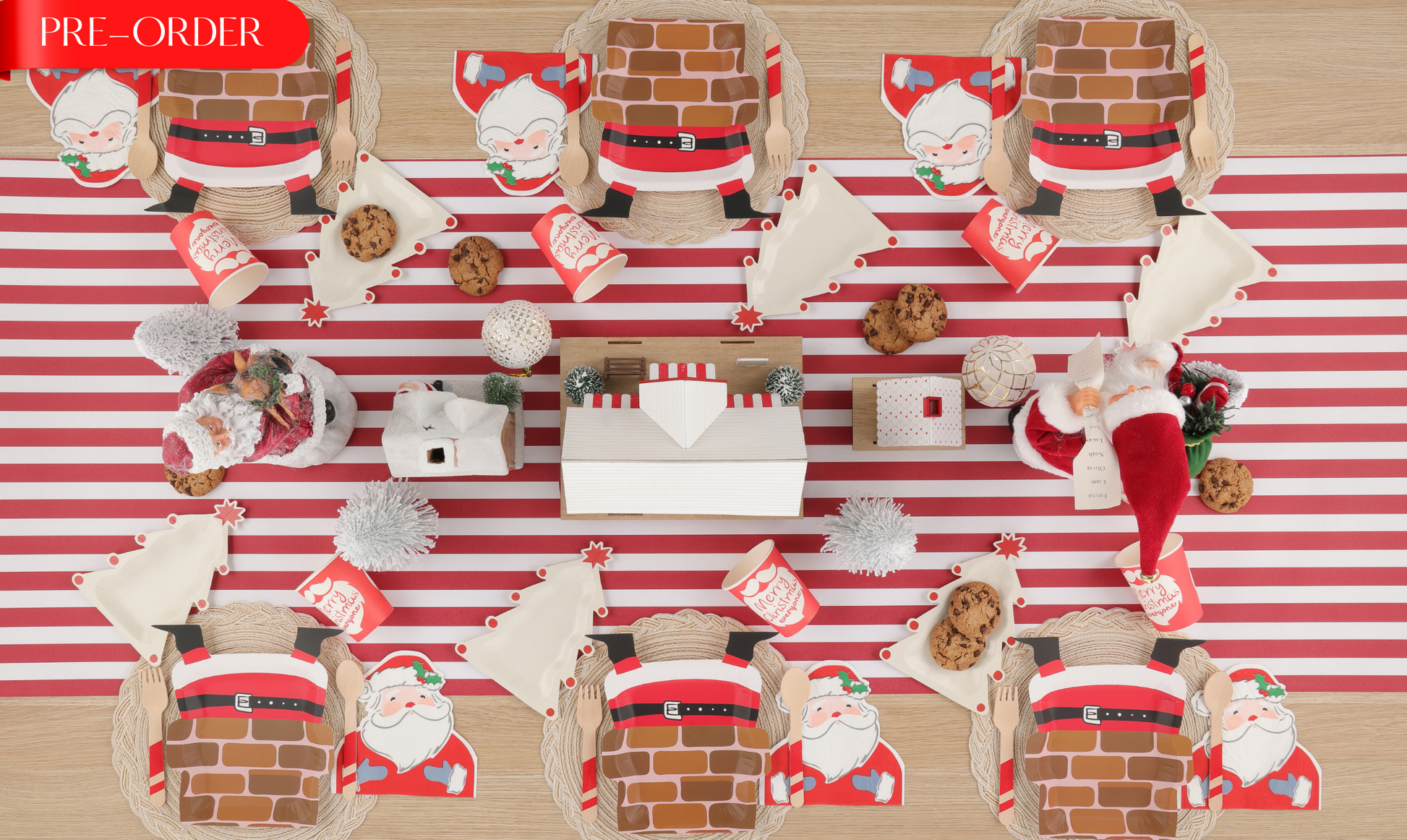 Make mealtimes magical for little ones with our Claus a Scene set! The large plate features Santa stuck in a chimney, paired with a dessert plate showcasing a white Christmas tree adorned with red baubles. Festive die-cut Santa napkins complete the set for extra fun!
