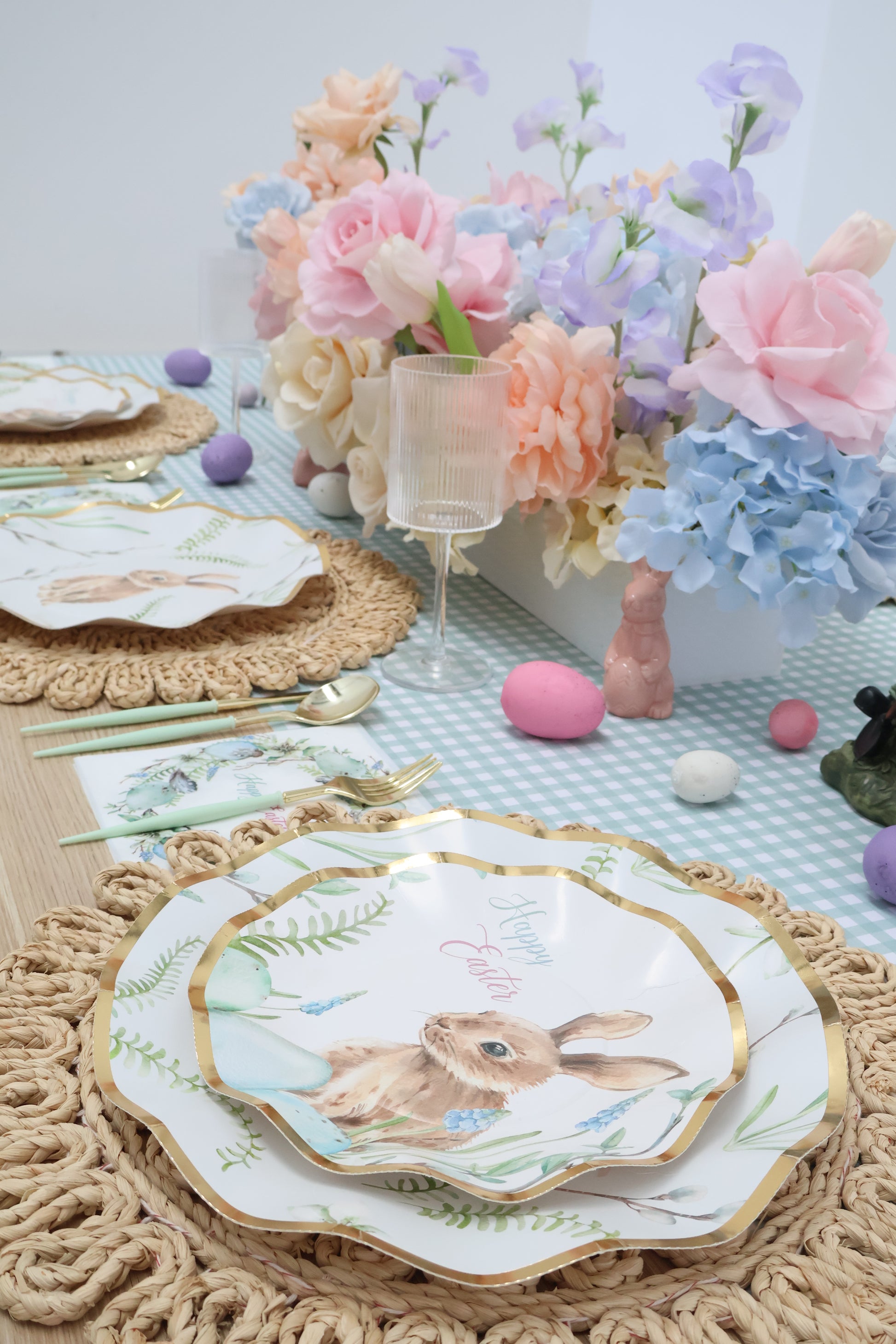 This set includes everything you need — dinner plates, entrée plates, napkins, cups, and cutlery — for a beautifully coordinated Easter tablescape that feels classic yet fresh.