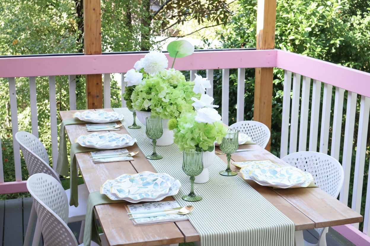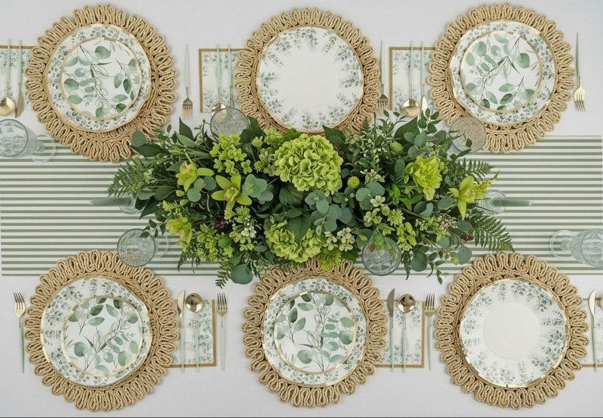 Bring nature to your table with our Garden of Eatin' set, featuring a fresh and vibrant leafy green design with a gold trim. This set is ideal for baby showers, outdoor picnics, or elegant occasions. The lush, botanical theme evokes the feeling of dining in a beautiful garden, blending freshness with refinement. Whether celebrating with friends or hosting family, this set adds a natural touch of beauty to your event.