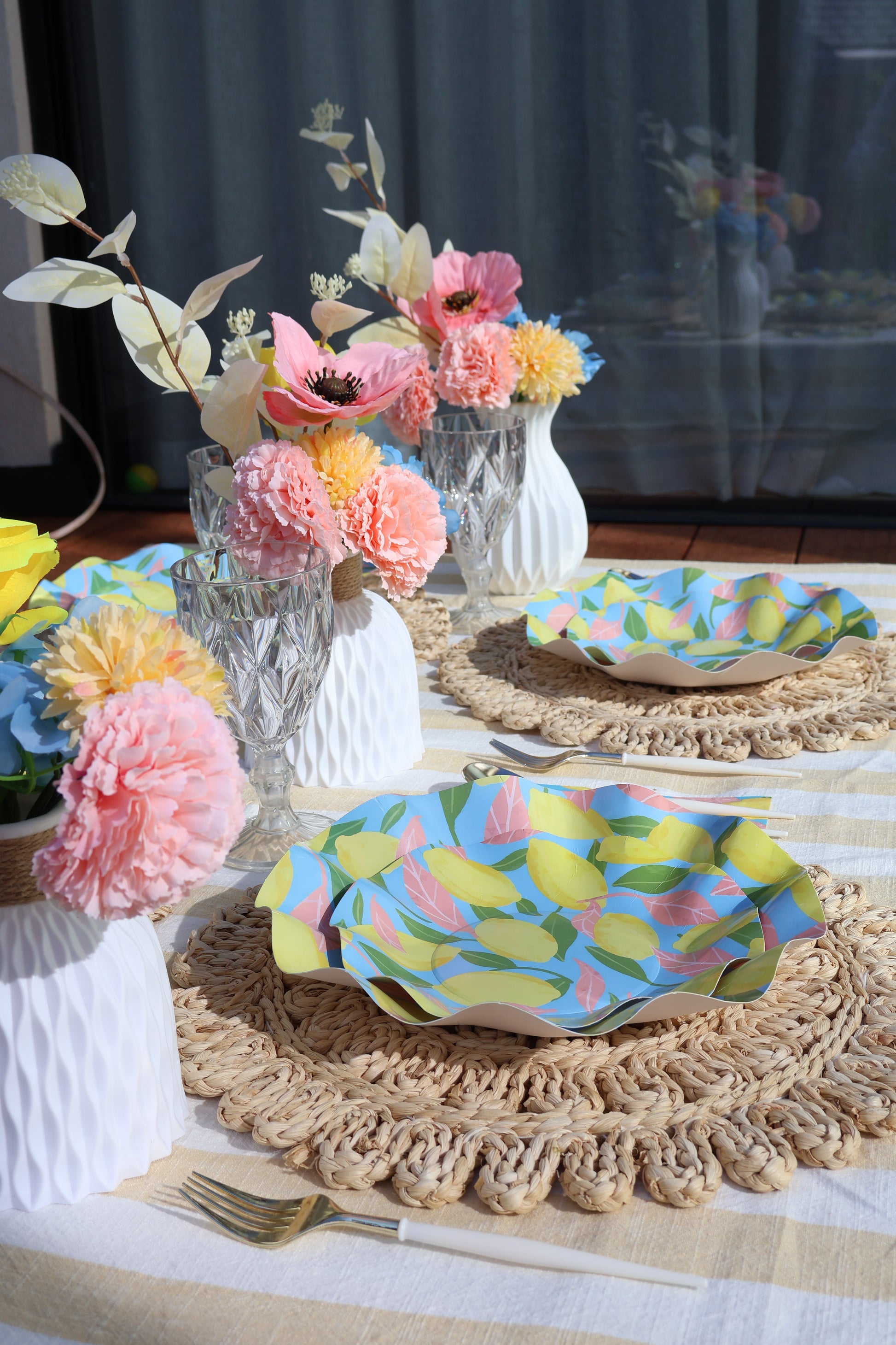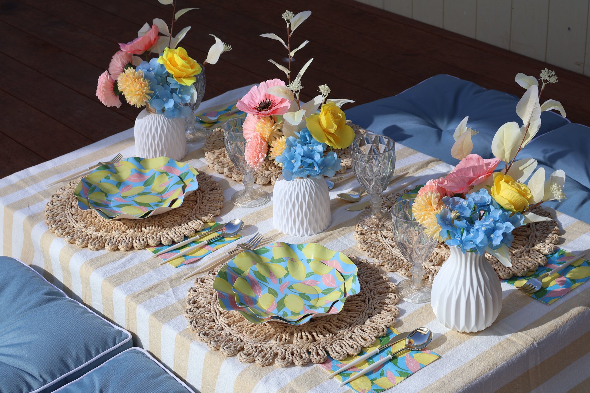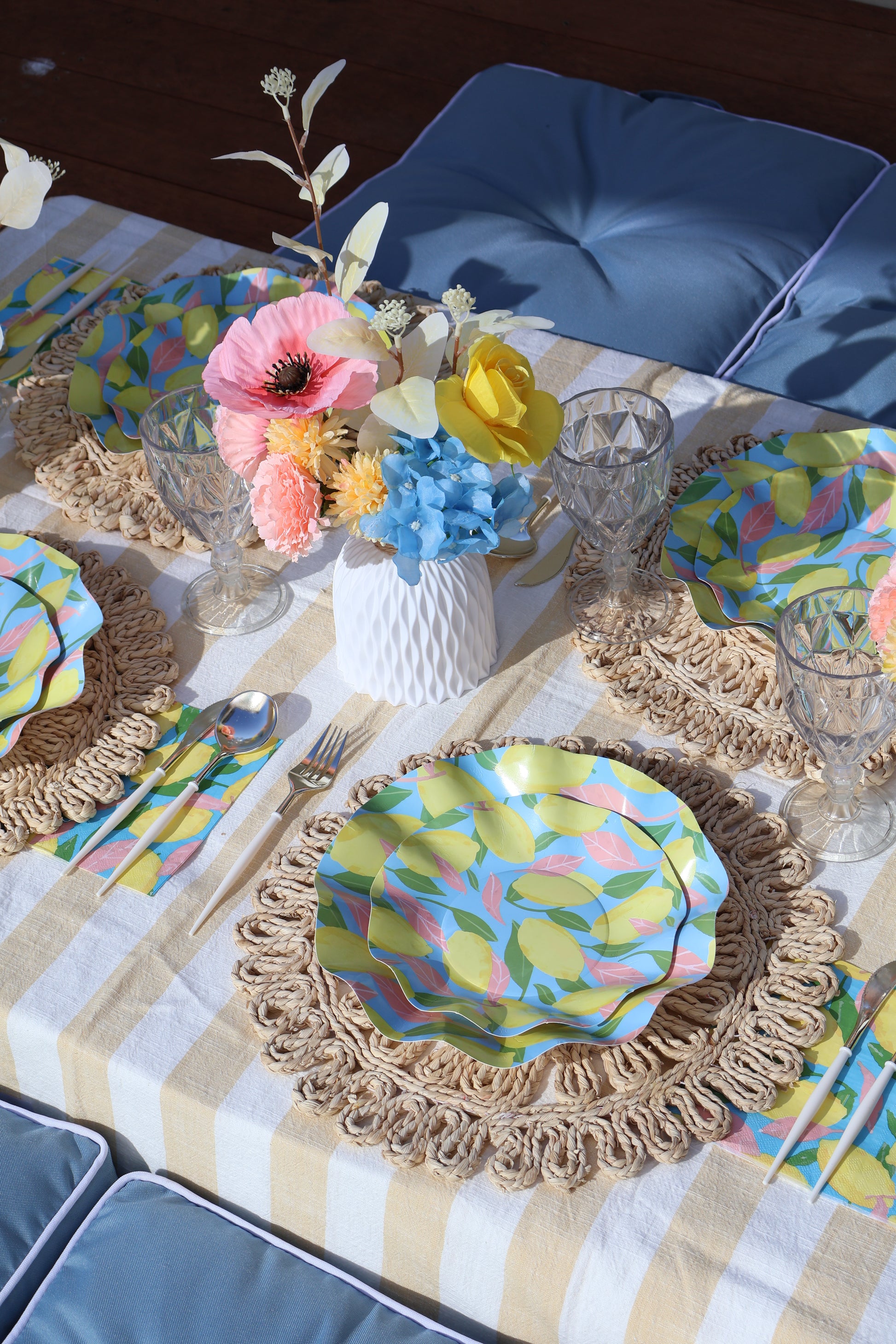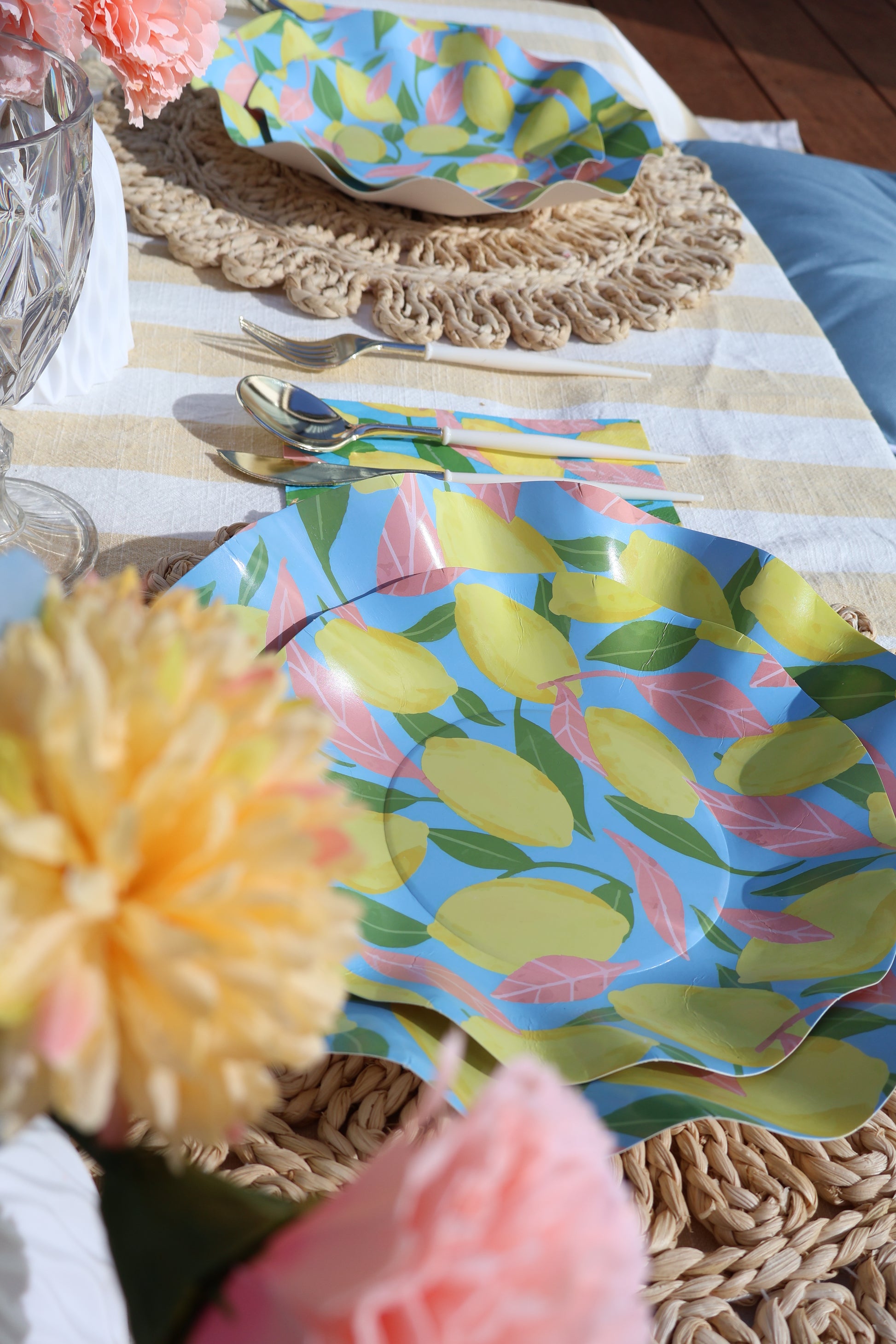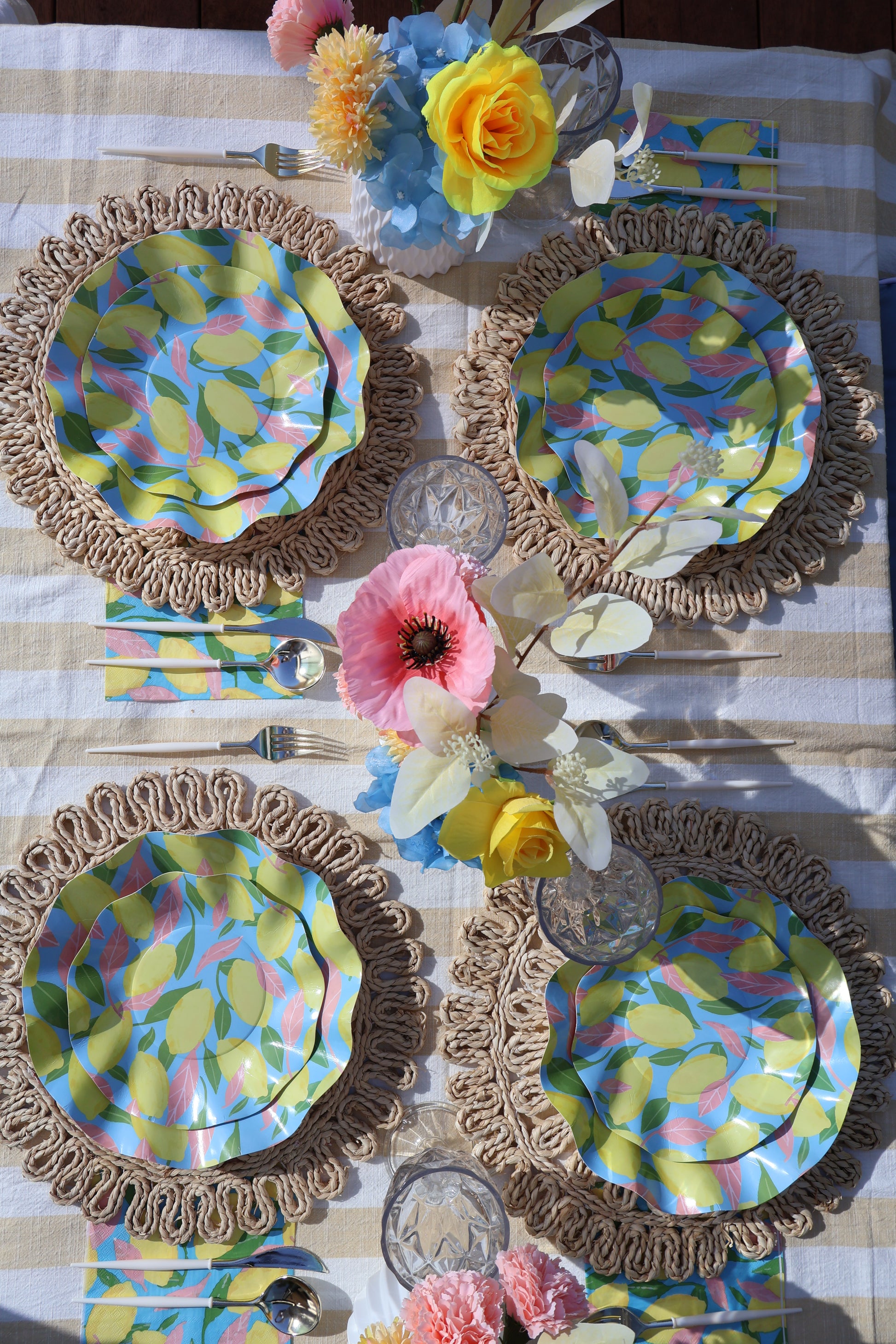 Brighten your table with the Simply the Zest set! Featuring a soft lemon design with pink leaves on a baby blue background, this collection is perfect for brunches, summer parties, or casual gatherings. The whimsical yet elegant design creates a light and joyful atmosphere for your guests.