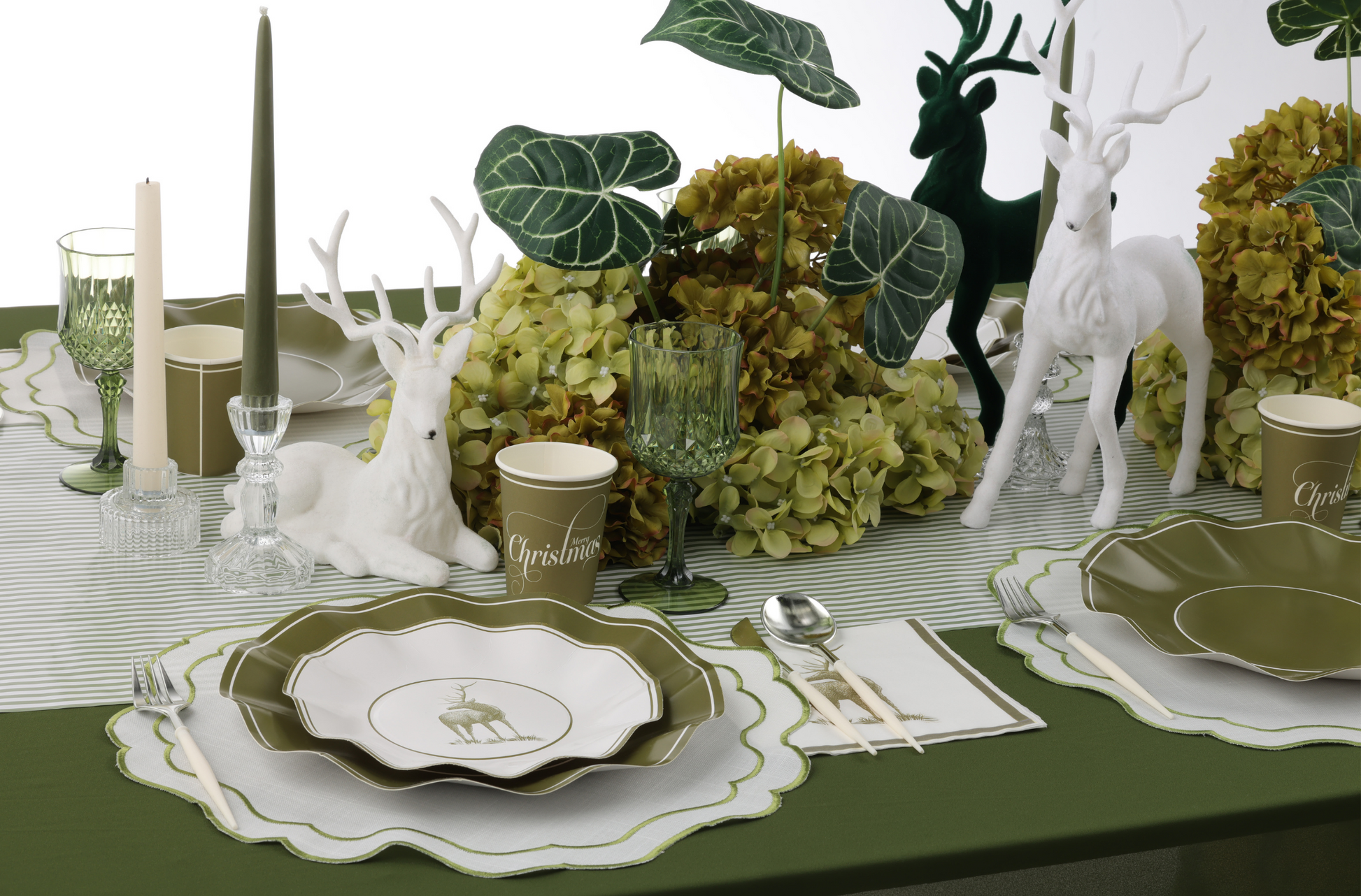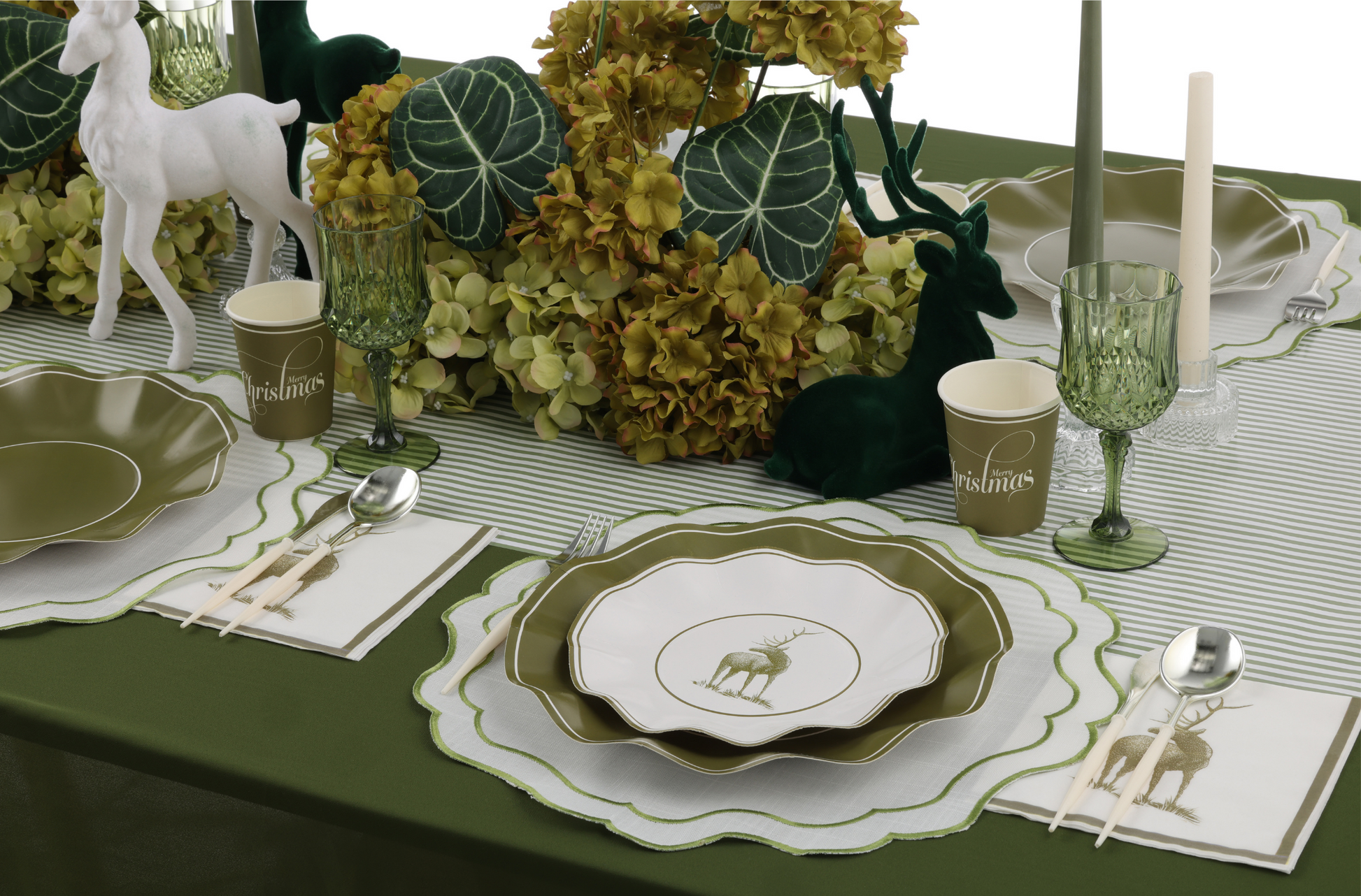 Bring timeless elegance to your table with our Evergreen set! Deep green rims and an etched reindeer make this collection the epitome of understated Christmas style, blending minimalism with a classy holiday twist—perfect for holiday parties, festive soirées, or christmas parties.