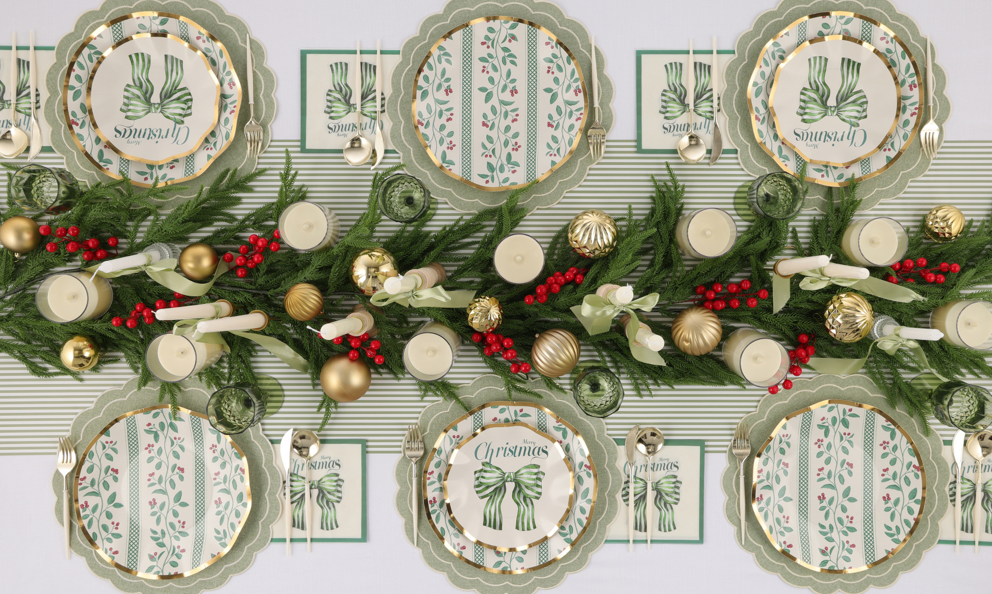 Deck your table with holiday charm using our Under the Mistle Bow set! Green mistletoe, red berries, and a festive bow give this vintage-inspired collection true Christmas spirit.